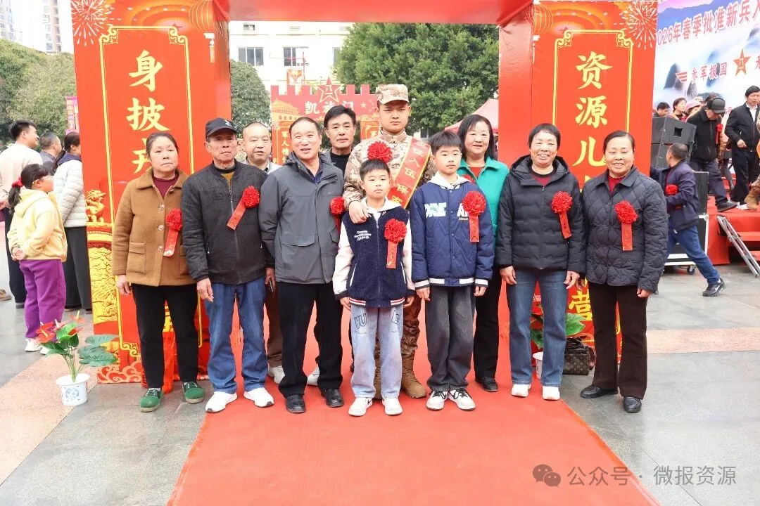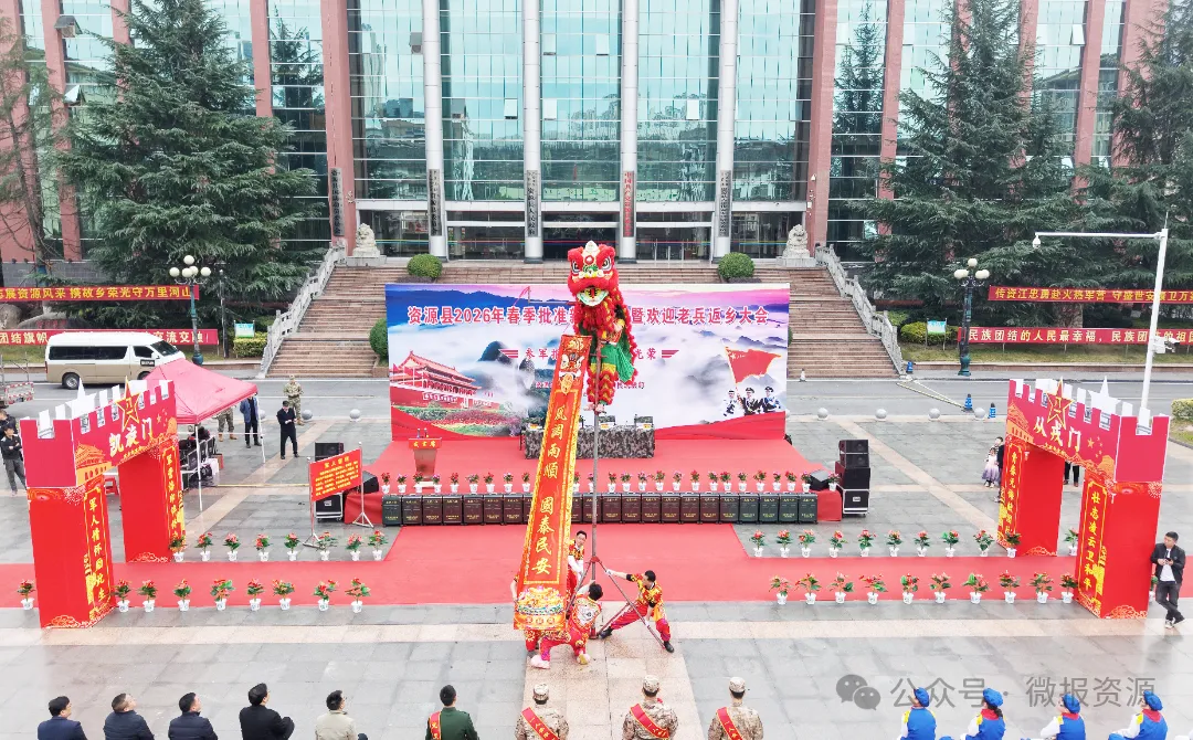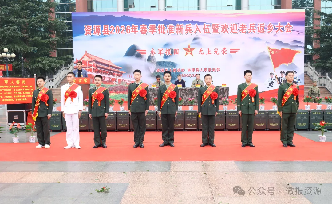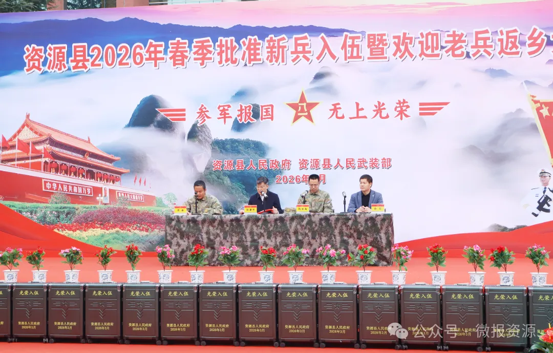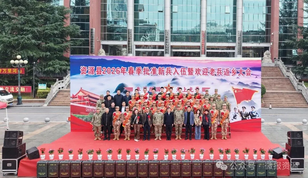 3月14日,资源县在县政府广场举行2026年春季批准新兵入伍暨迎老兵返乡大会,热烈欢迎退役老兵荣归故里,欢送新兵光荣入伍。