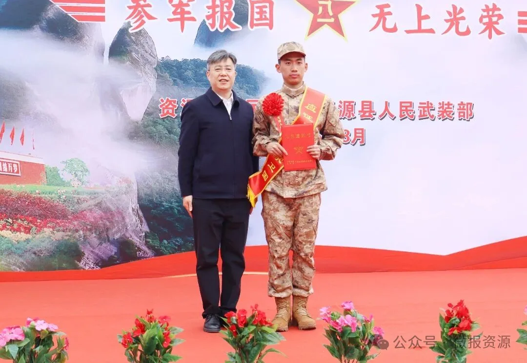 ▲资源县委副书记、县长陈建华给新兵颁发入伍通知书并合影留念