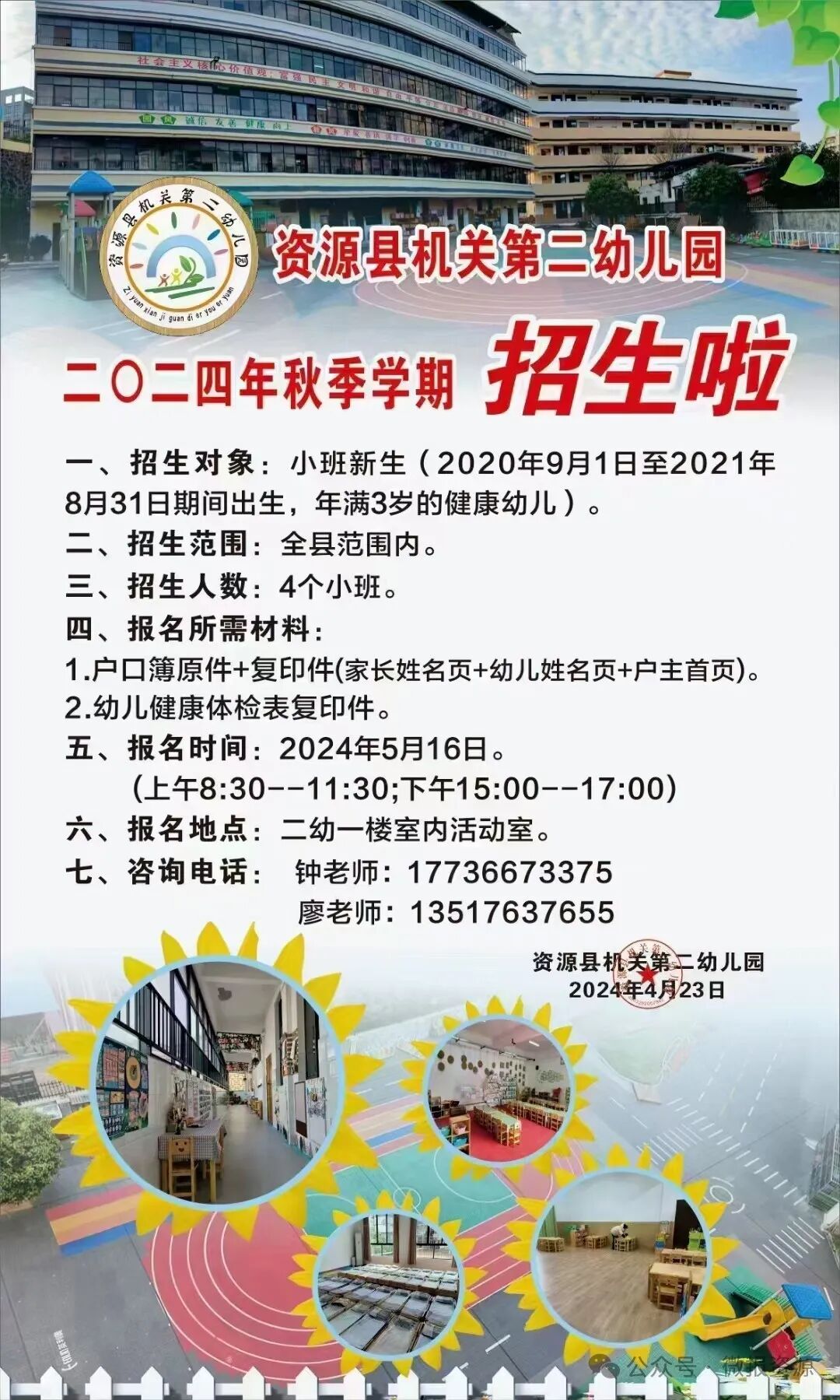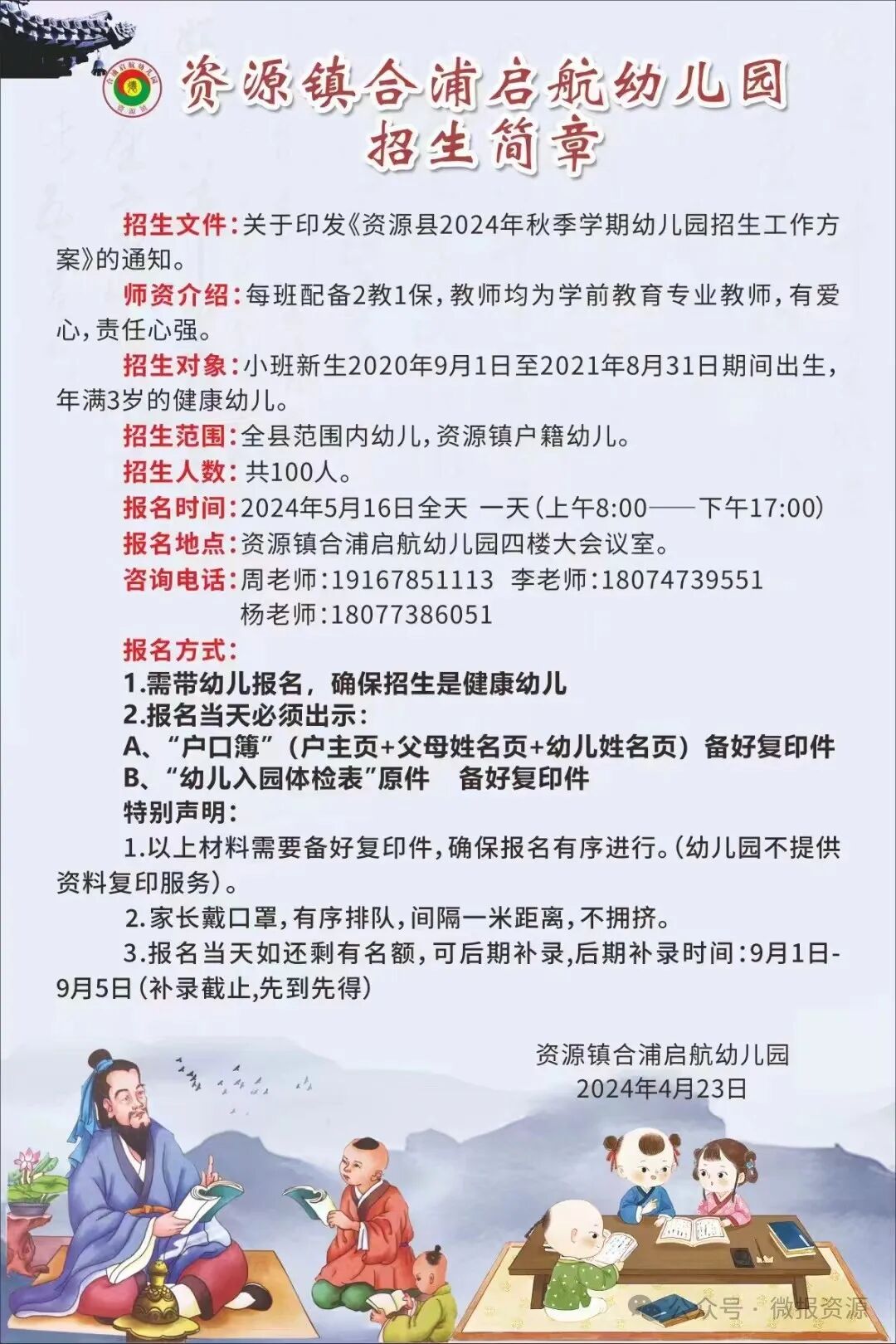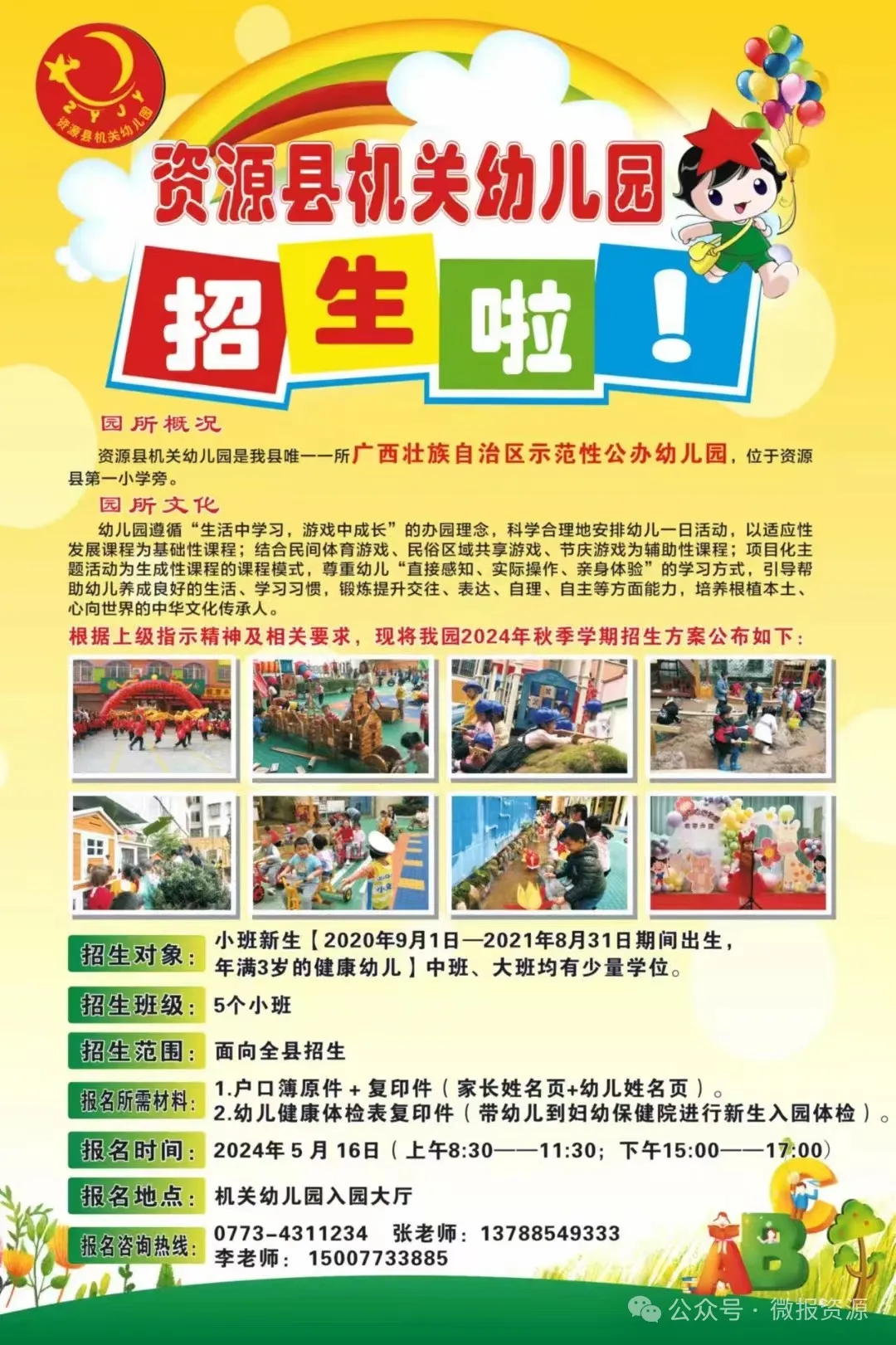 资源县机关幼儿园、资源县机关第二幼儿园、资源镇合浦启航幼儿园招生简章