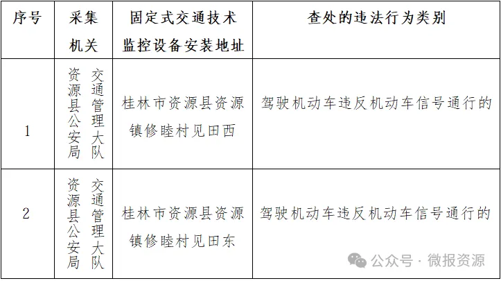 为强化路面监控,进一步加强道路交通管理,有效遏制交通违法行为,为群众出行创造安全、有序、畅通的良好交通环境,资源县公安局交通管理大队拟启用以下路段2处新增固定式交通技术监控设备,对机动车违法行为进行拍摄取证,并依法处罚。